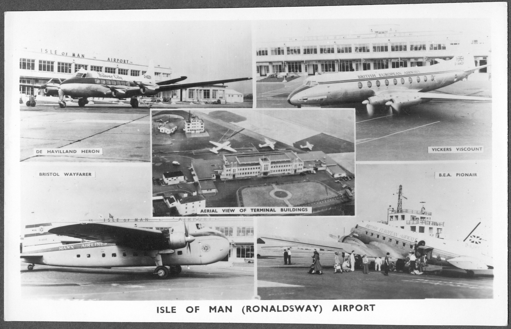 A1409. RONALDSWAY AIRPORT Montage: Postcard early 1960s showing the Terminal, plus Manx Airlines DH Heron, Silver City Wayfarer, BEA Dakota & Viscount. £8.00