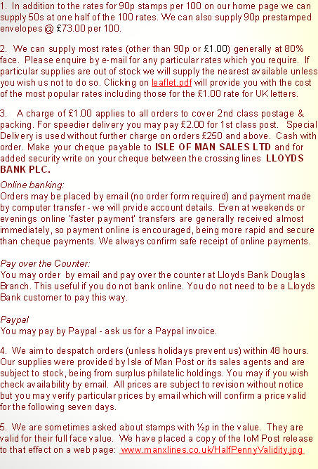 Isle of Man Sales LtdBeech House 19B Arlington Drive Nottingham NG3 5ENTel/Fax 0115 9105 925 E-mail iomsales@manxlines.co.uk Website www.iomstamps.co.ukRegistered in England No 2111541